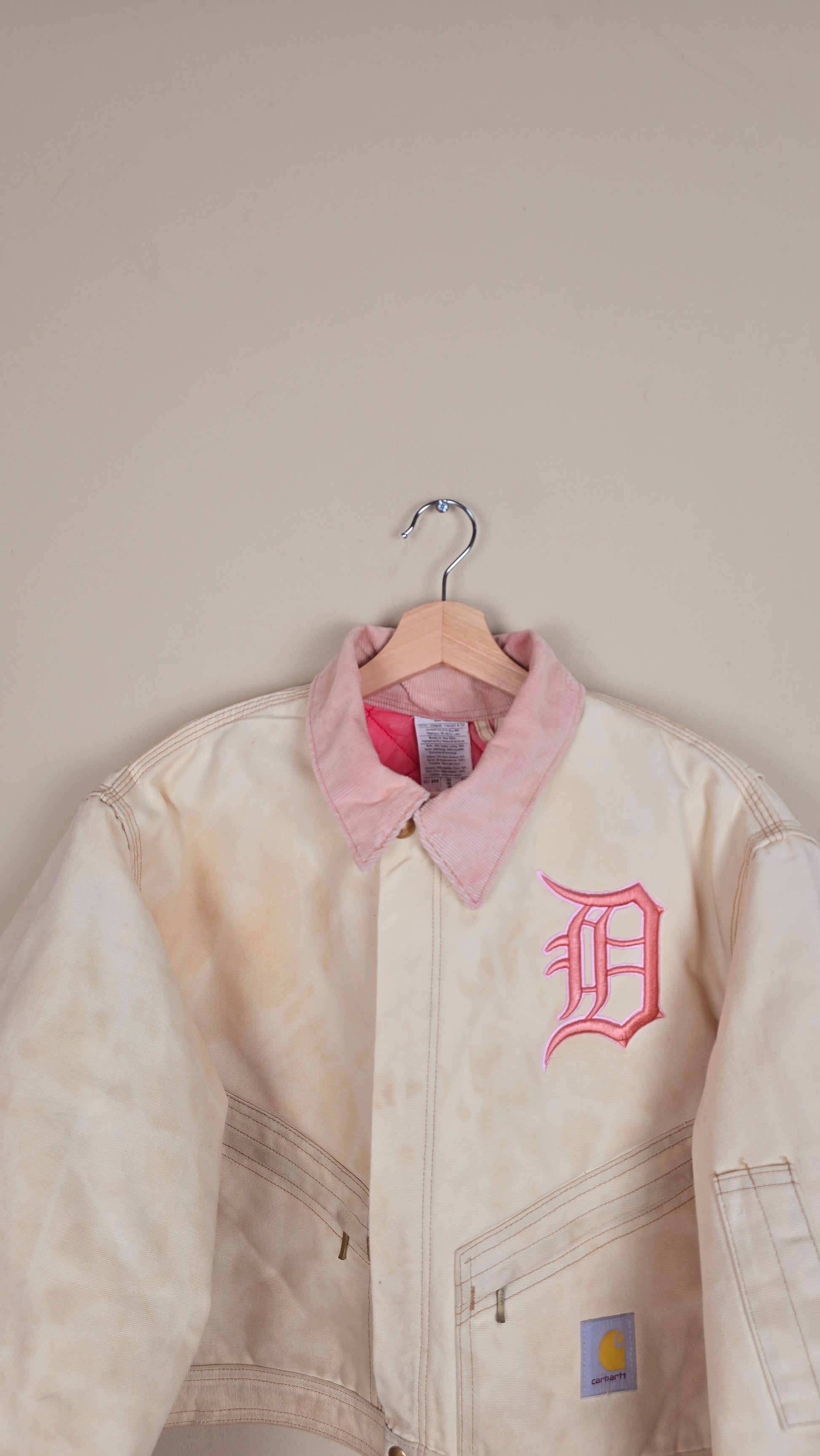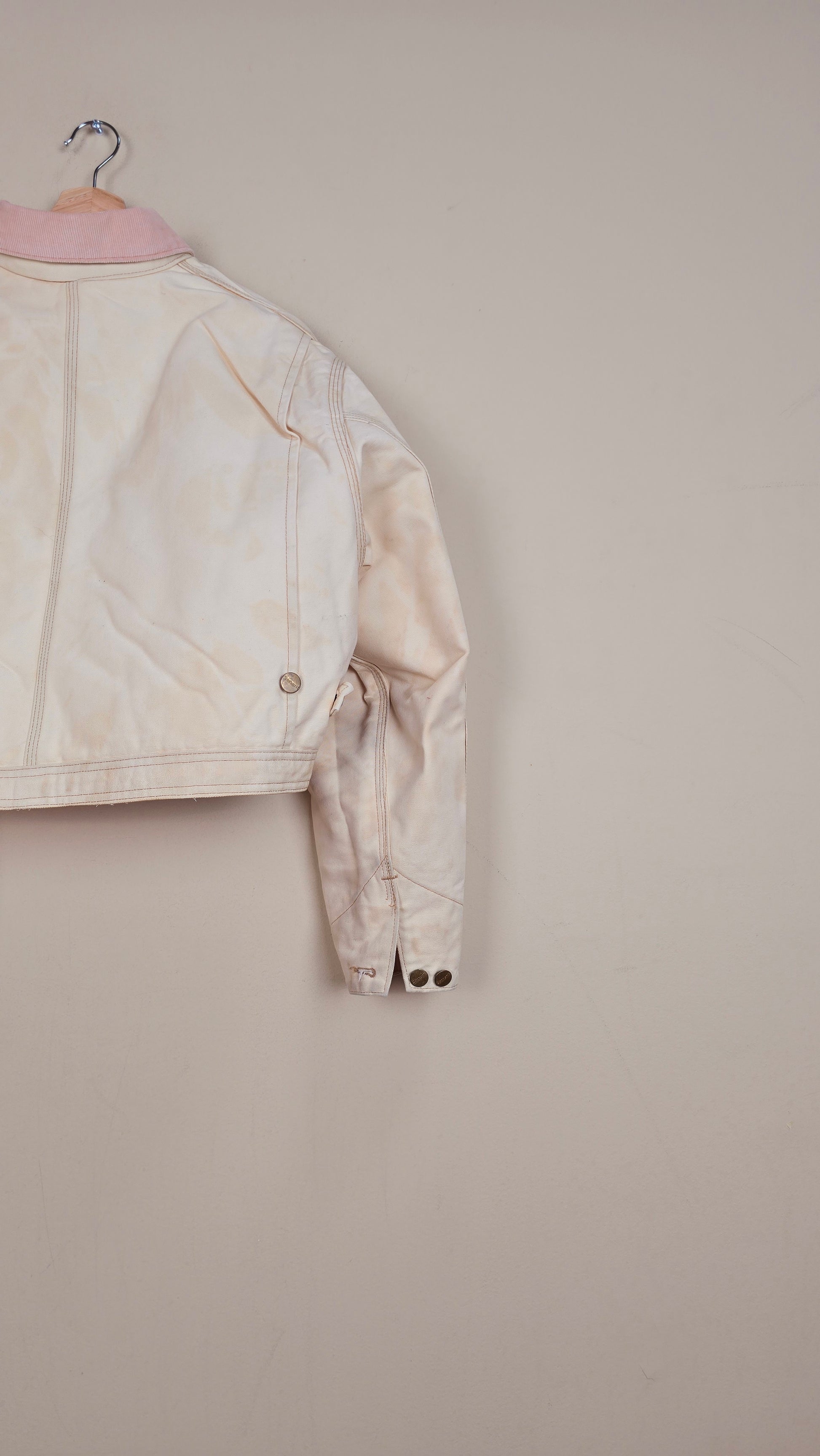 Featuring early 90s crop style Carhartt Jacket in beige with contrasting corduroy collar.