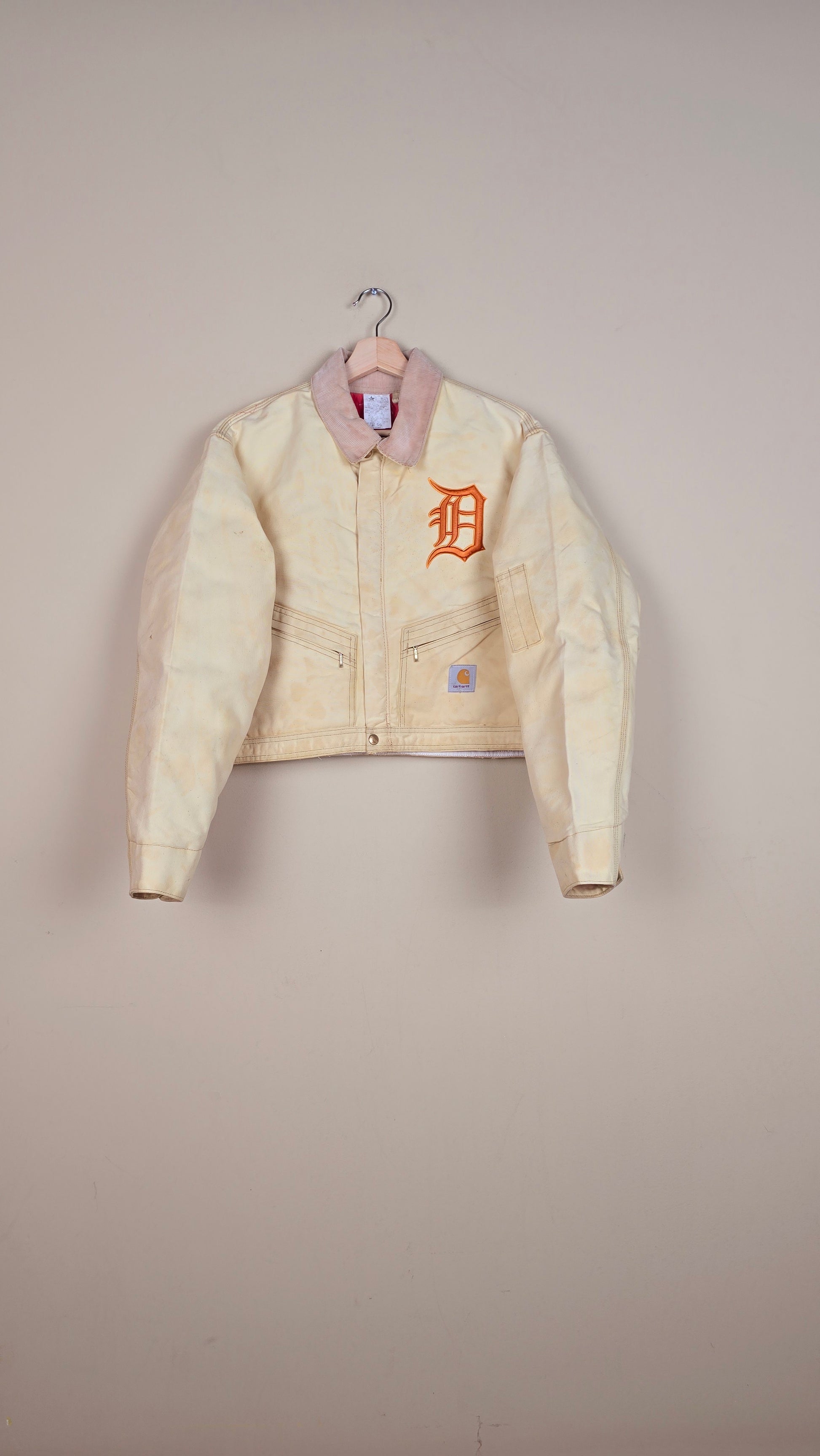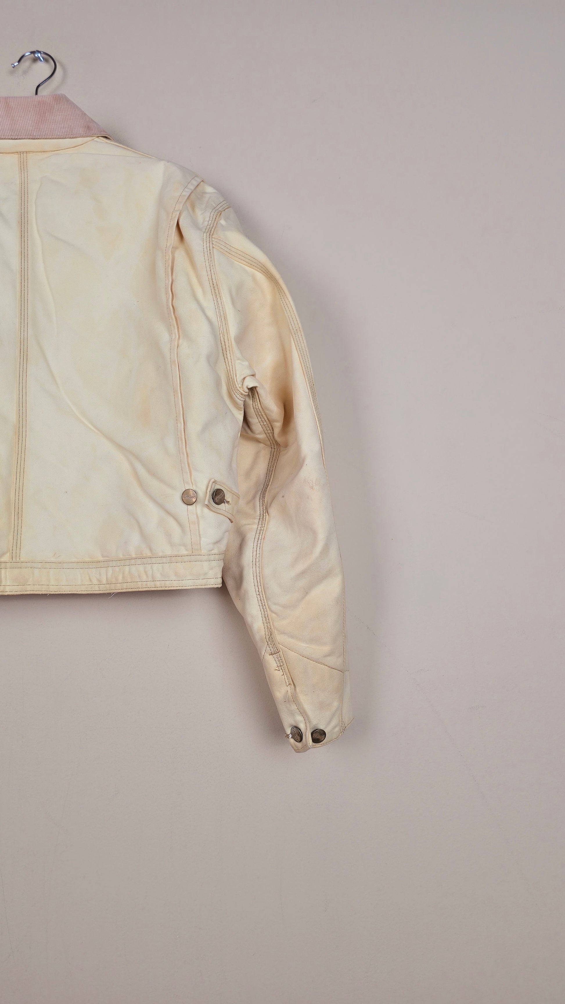 Featuring early 90s crop style Carhartt Jacket in beige with contrasting corduroy collar.
