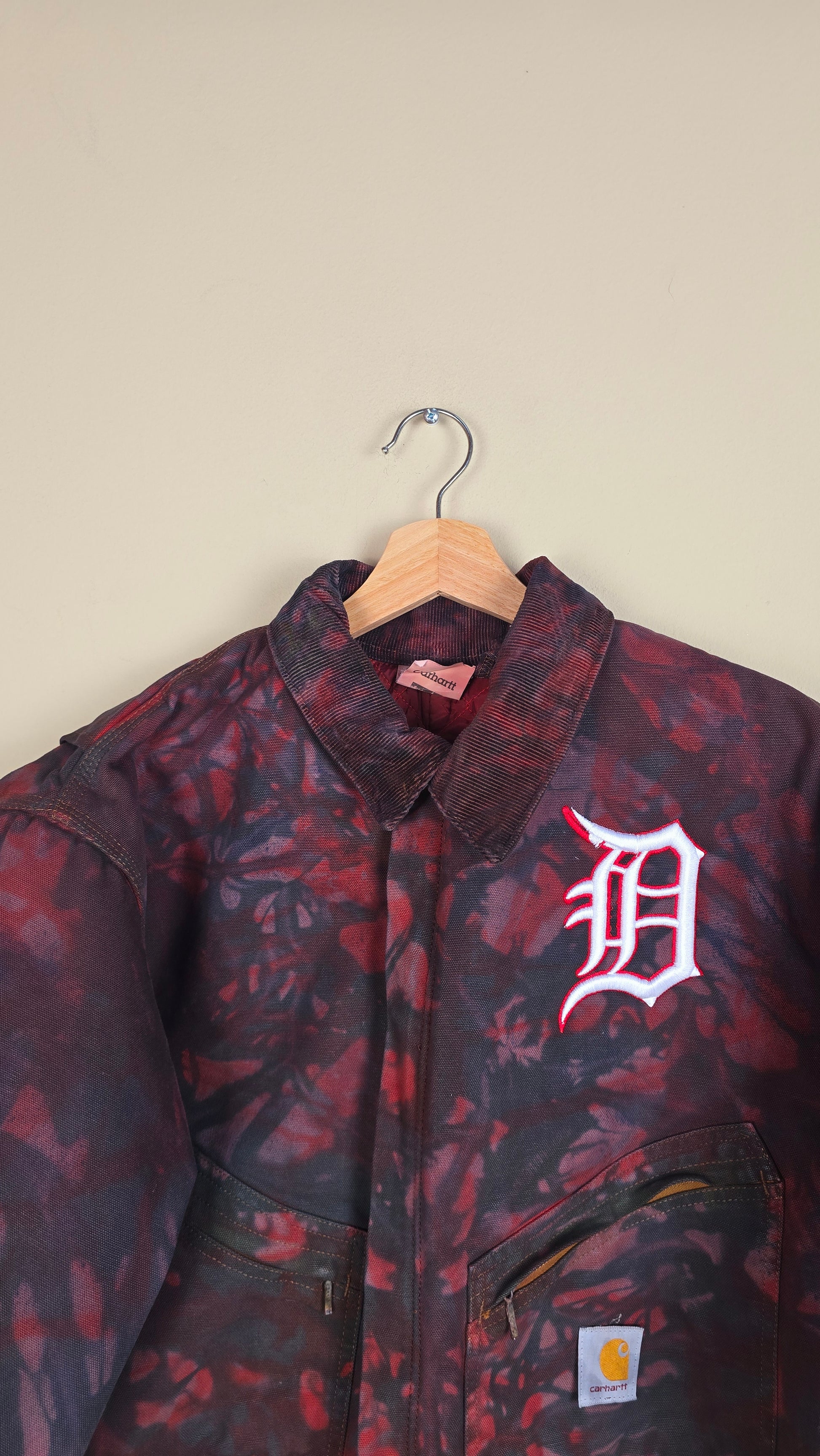 Featuring early 90s crop style Carhartt Jacket in camo red with green undertones.