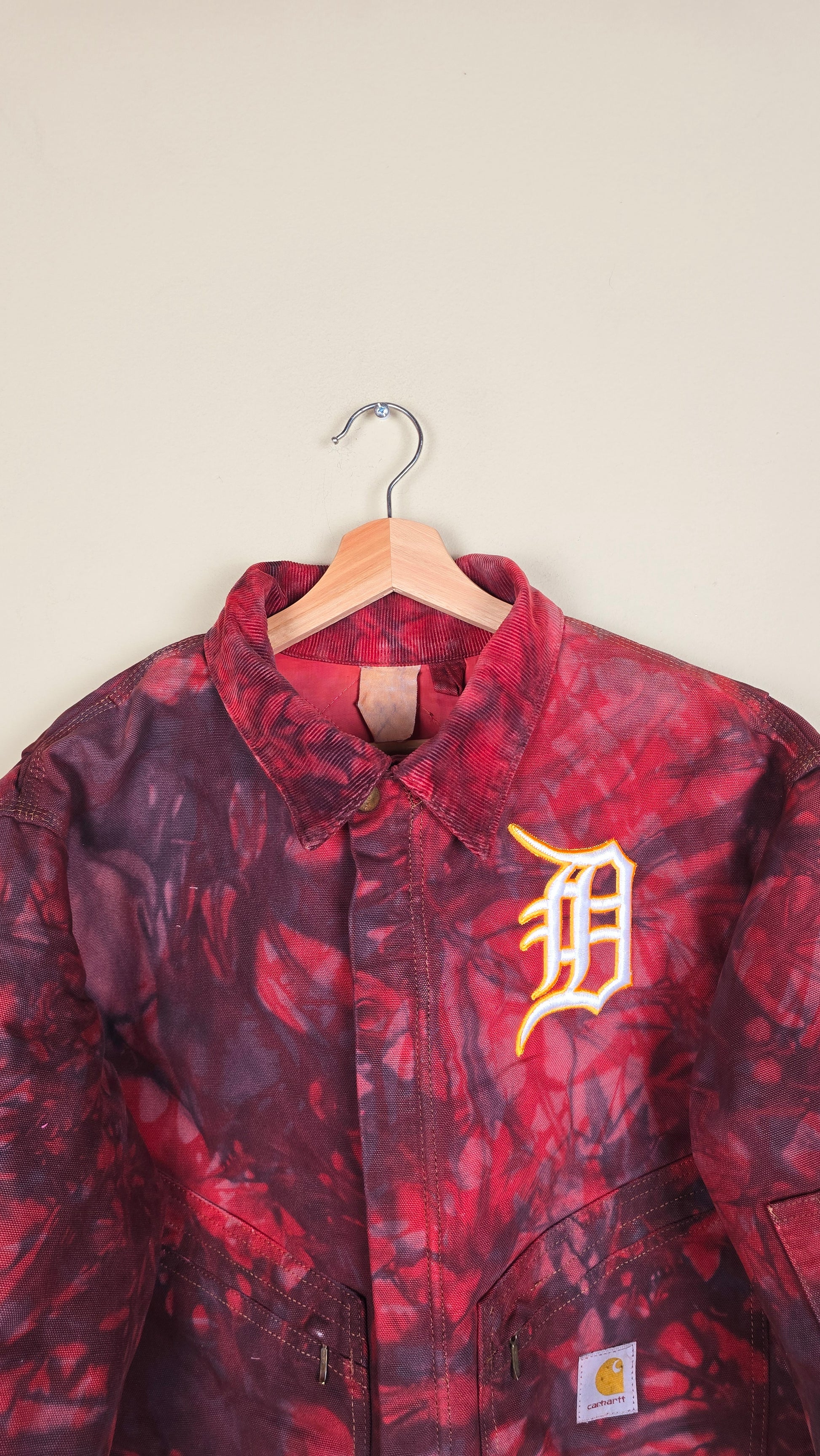 Featuring early 90s crop style Carhartt Jacket in camo red with blue undertones.