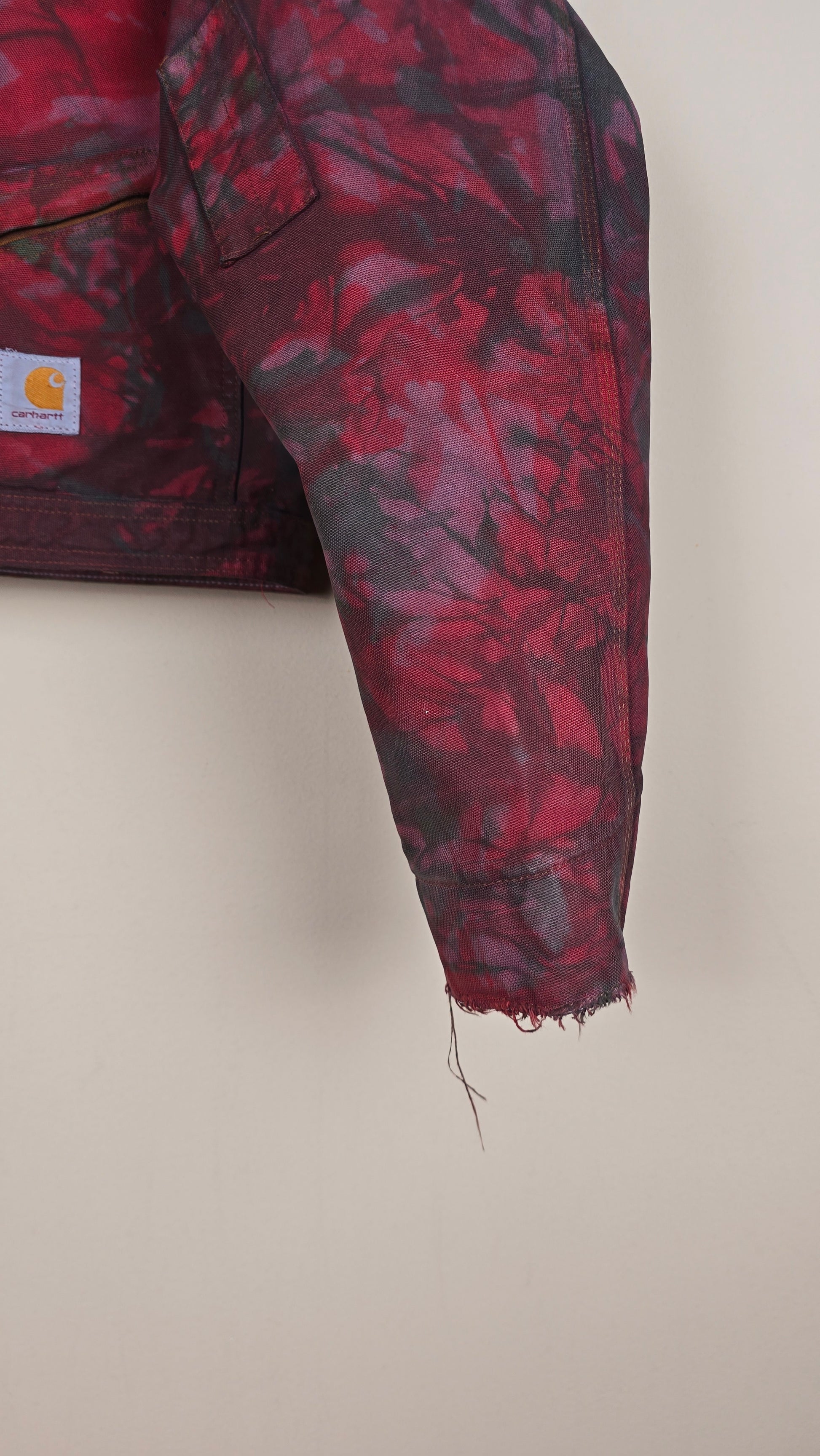 Featuring early 90s crop style Carhartt Jacket in camo with red and green accents.