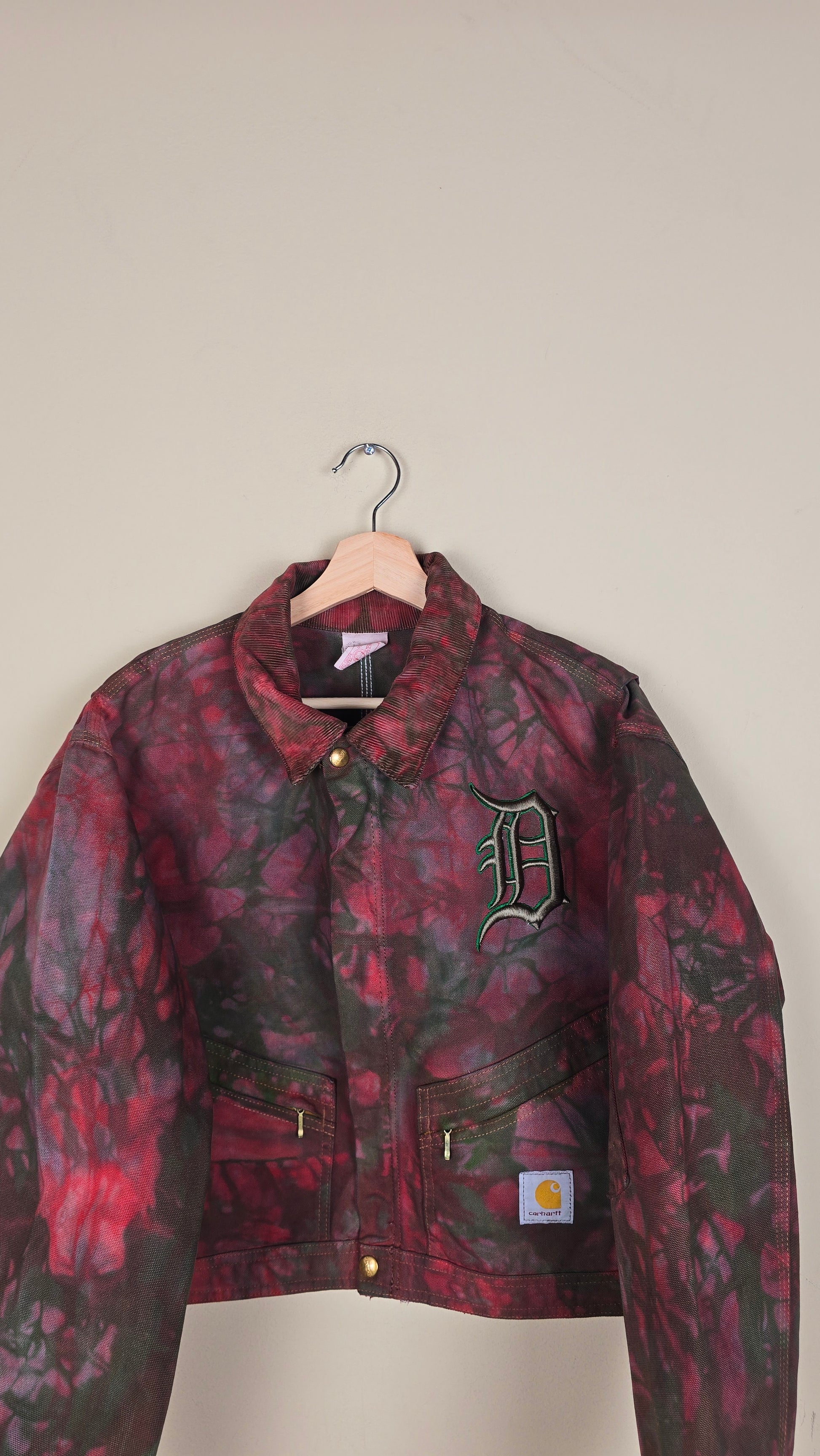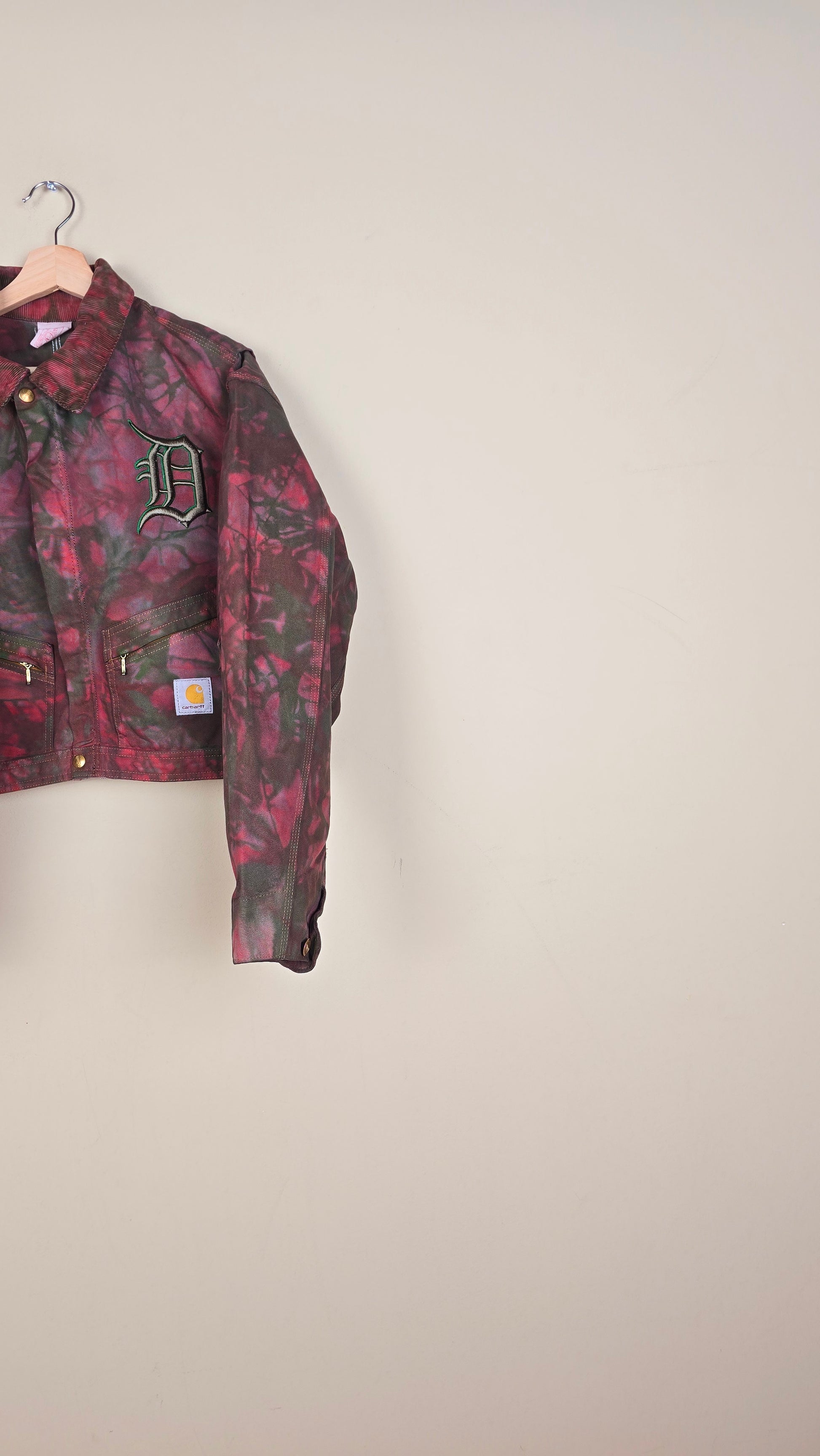 Featuring early 90s crop style unlined Carhartt Jacket in camo green with red undertones.