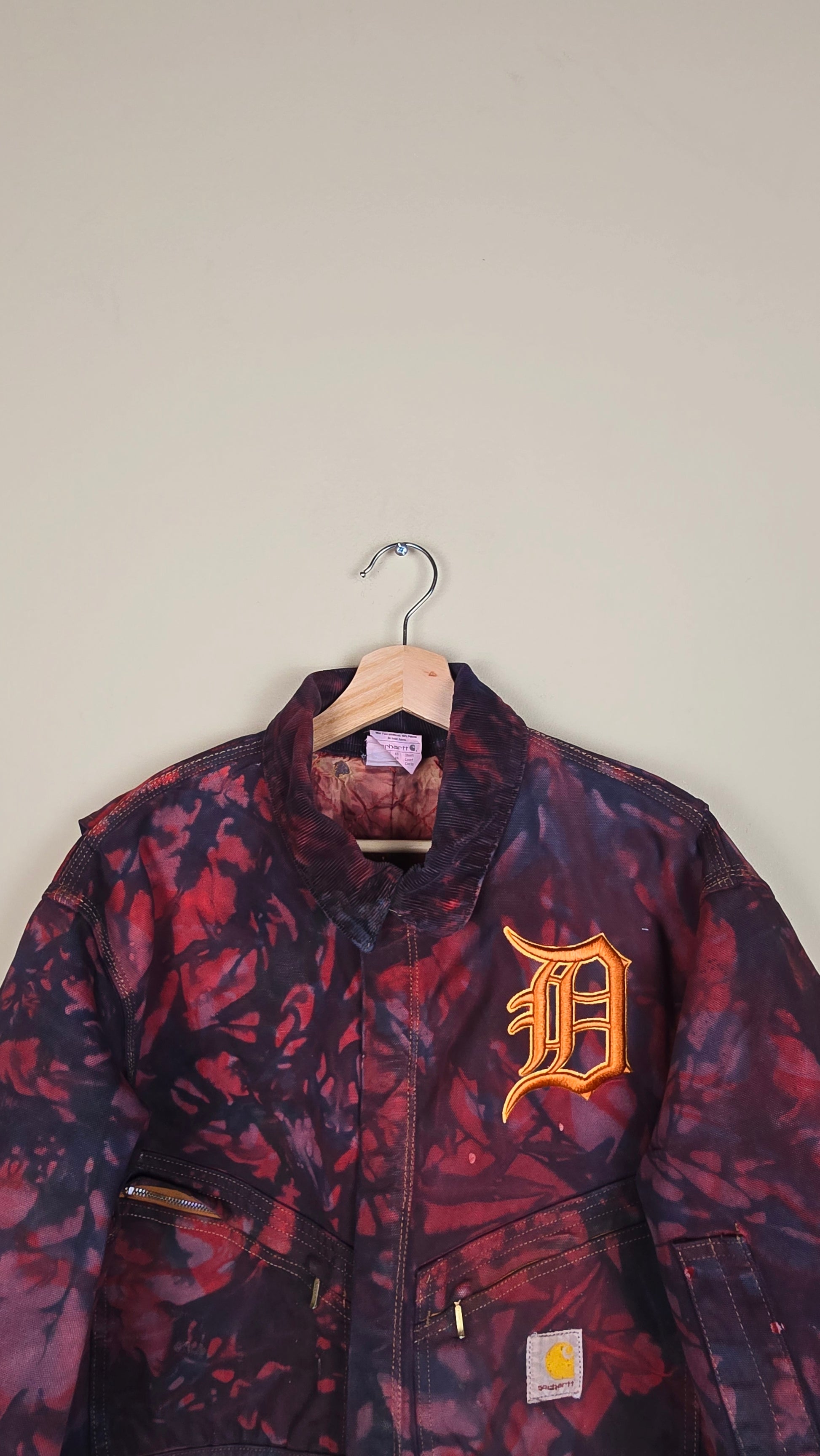 Featuring early 90s crop style Carhartt Jacket in camo green with red undertones.