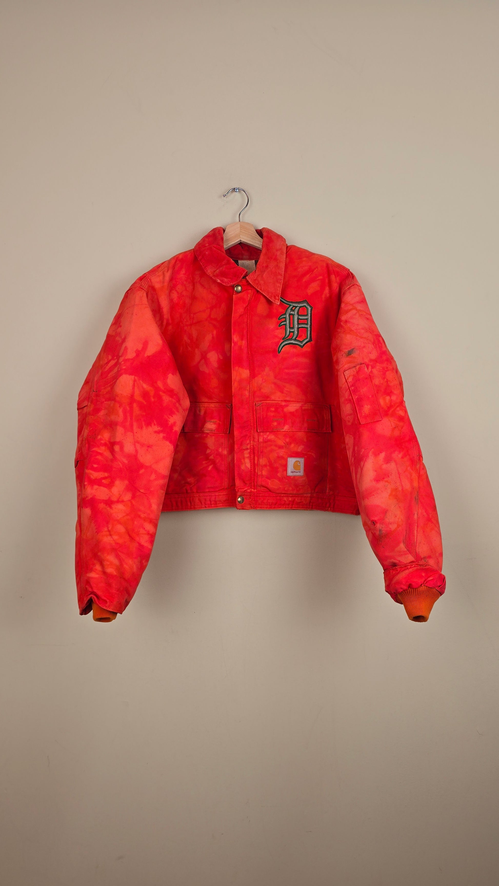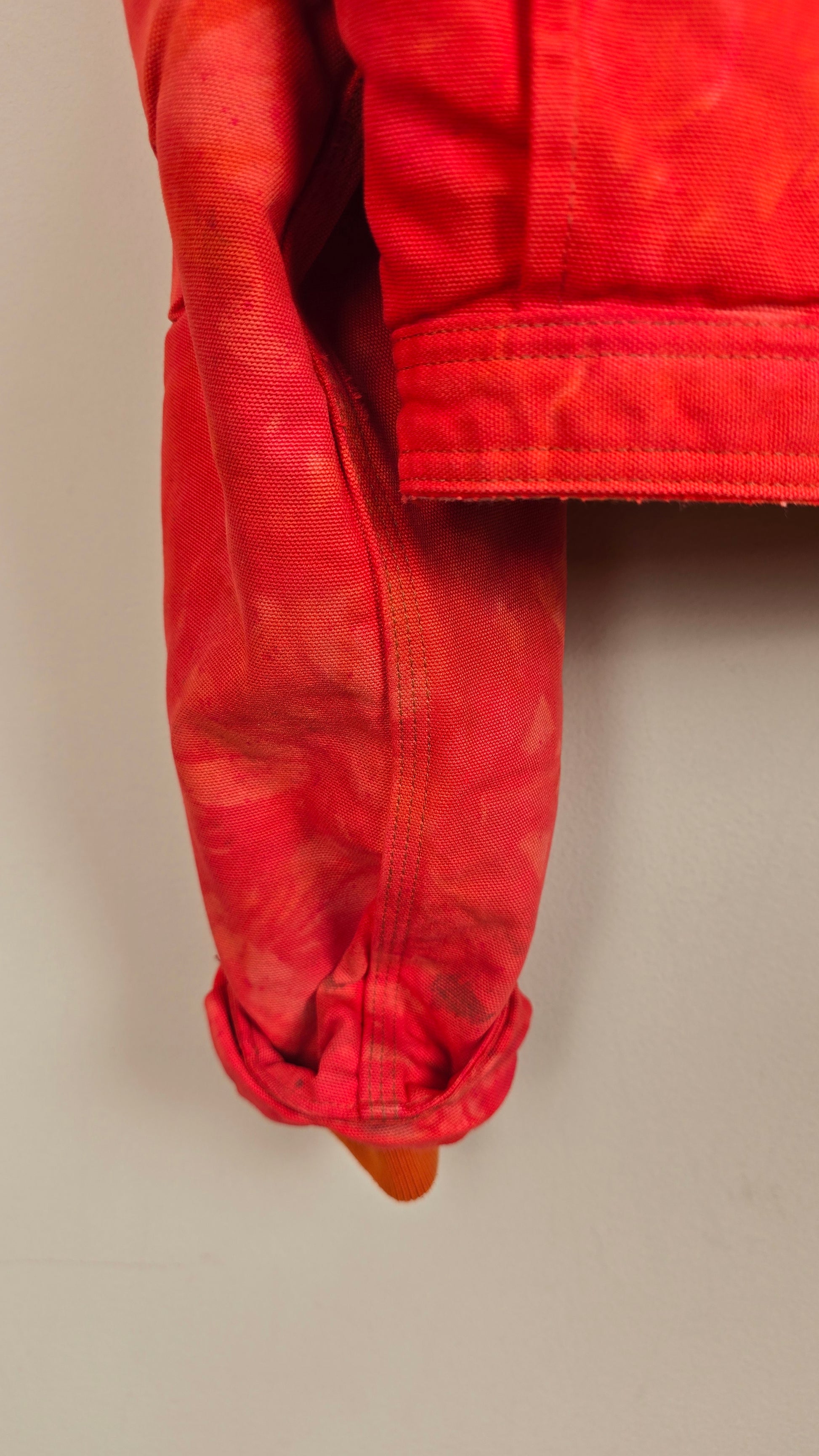 Featuring early 90s crop style Carhartt Jacket in orange with added insulation and contrasting cuff sleeves.