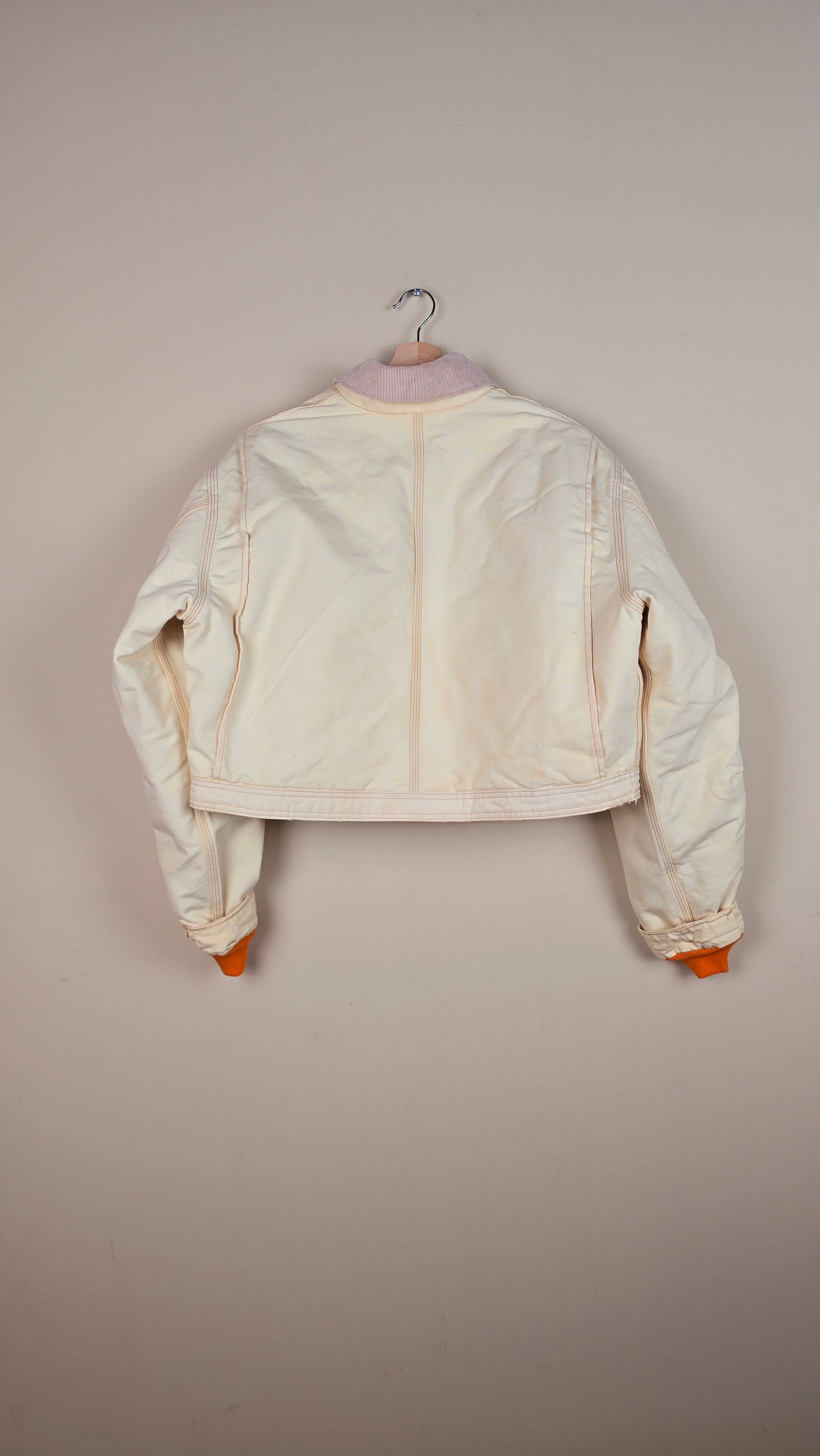 Featuring early 90s crop style Carhartt Jacket in beige with added insulation and contrasting sleeves.