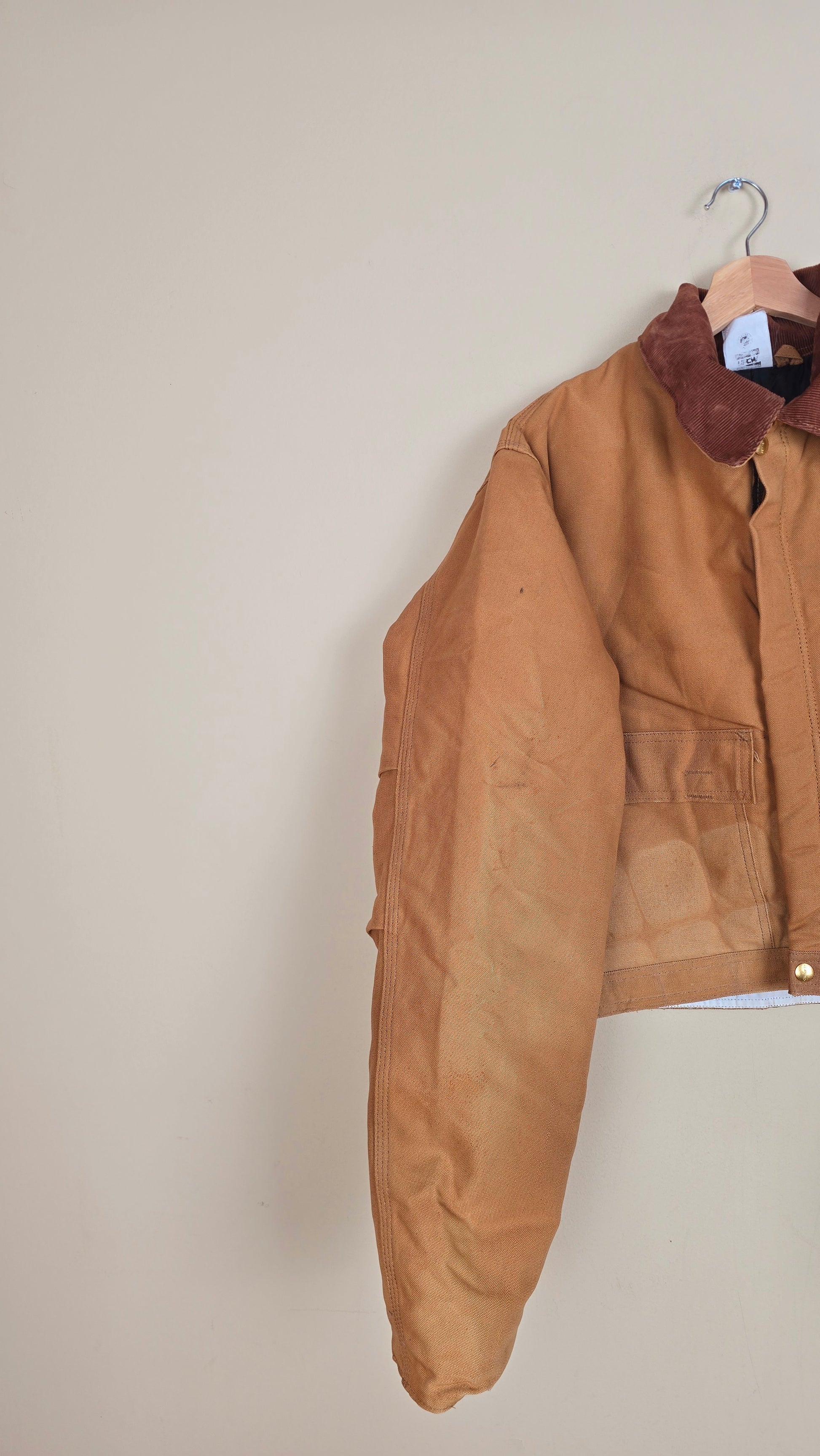 Features early 90s crop style Carhartt Jacket in carton brown.