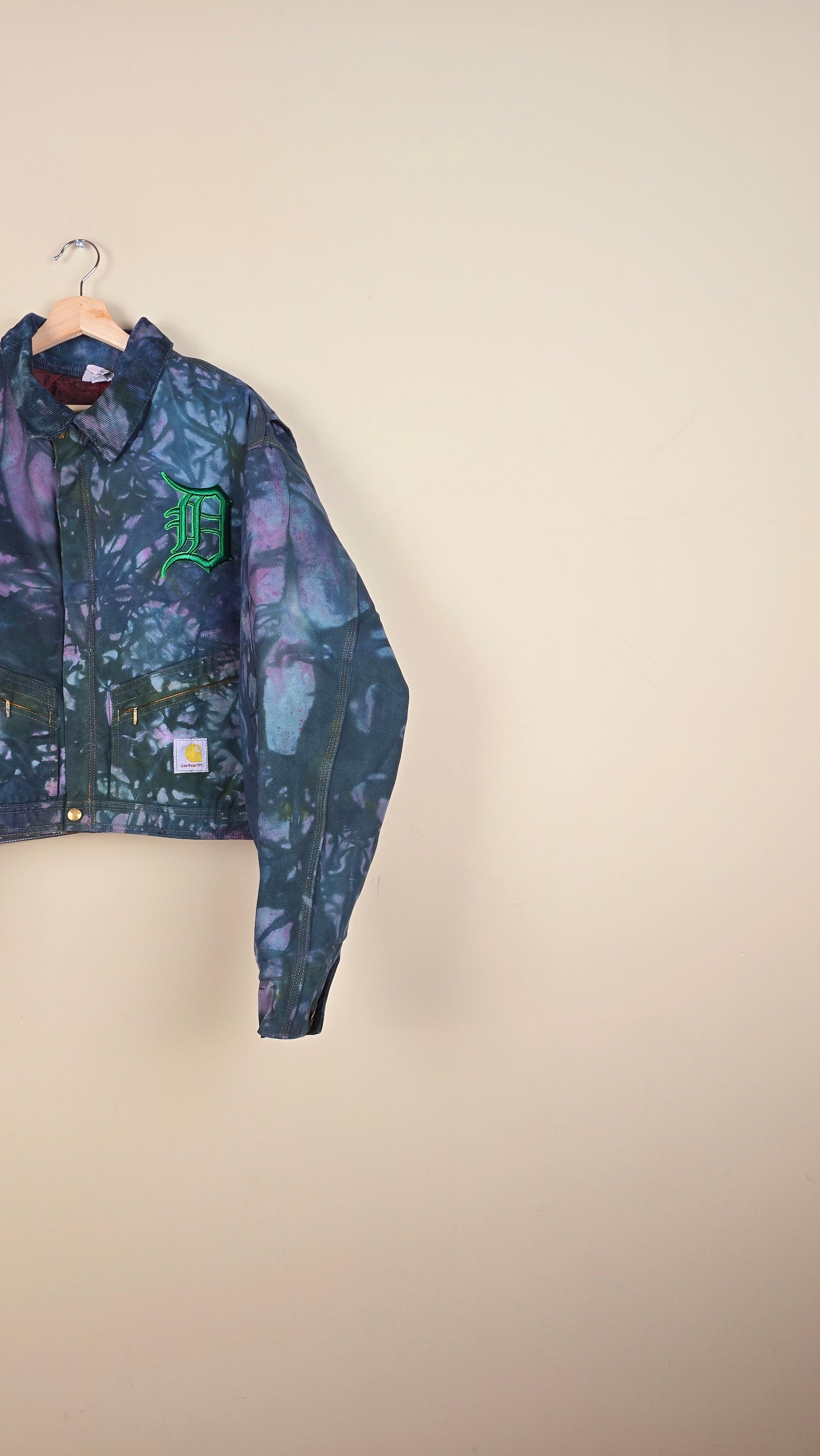 Featuring early 90s crop style Carhartt Jacket in camo with green and red accents.