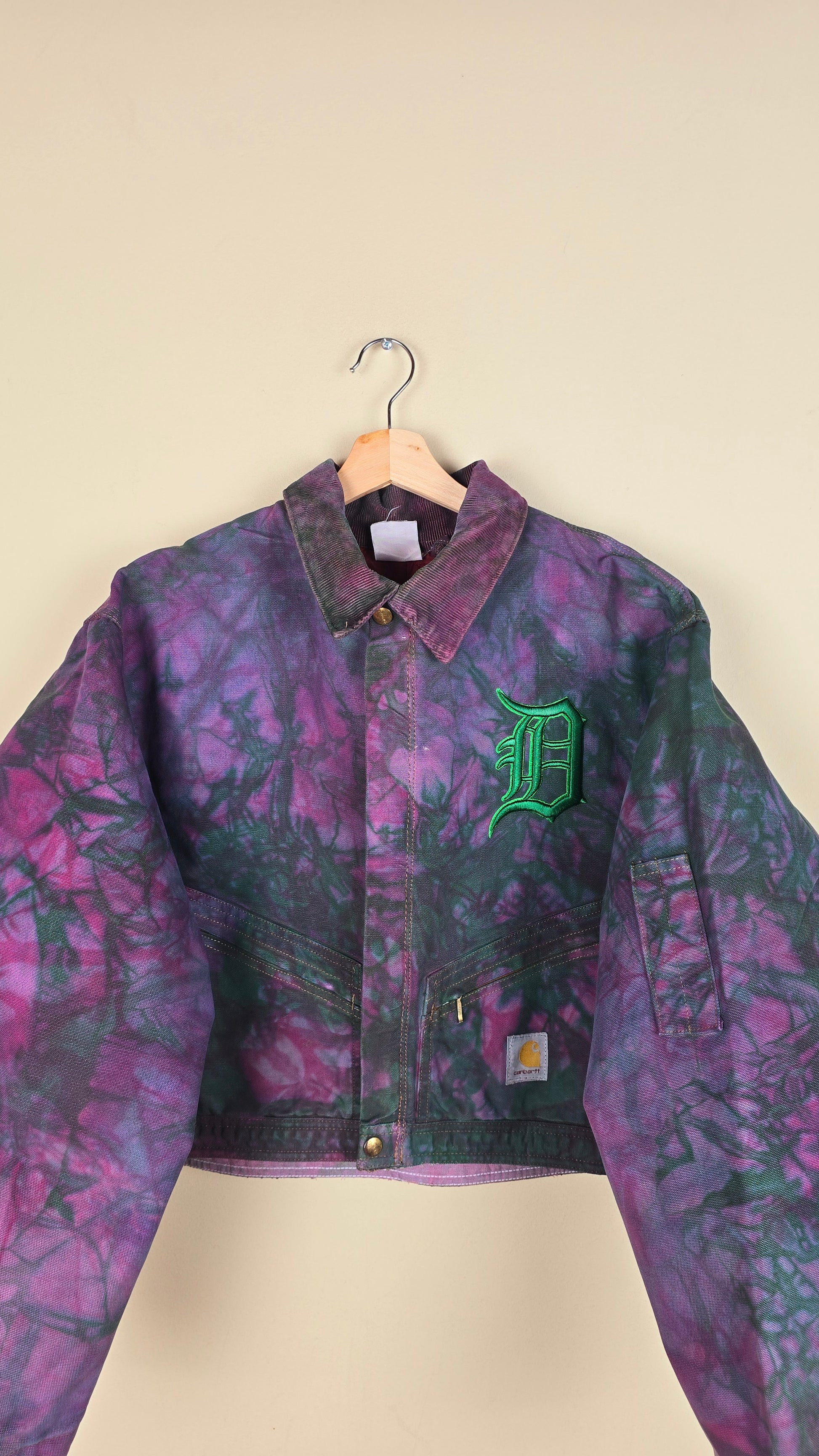 Featuring early 90s crop style Carhartt Jacket in camo with green and purple accents.
